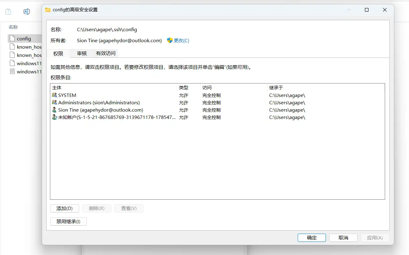 经排查后,确认是config的权限给了一个不知名的用户(可能是病毒,也可能是双系统中linux里授权的)解决方法就是删掉此用户的权限:即解除继承,然后删除。