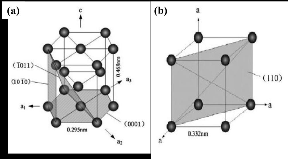 钛有两种同素异构体,其中882.5℃以下是密 排六方结构的α钛,882.5℃以上是体心立方结构的β钛。常温条件下金属钛为密排六方晶体结构,其轴比(c/a=1.587)小于理想球形轴比1.633,由于其晶体结构的特殊性,赋予了金属钛良好的加工性能。