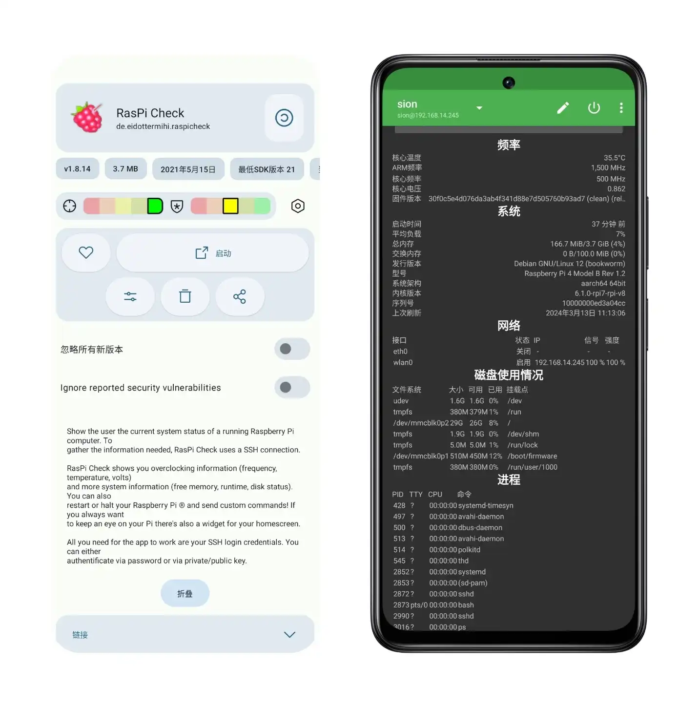 安卓上还有一个名为RasPi Check的软件,可以监控树莓派的状态,很是好用: