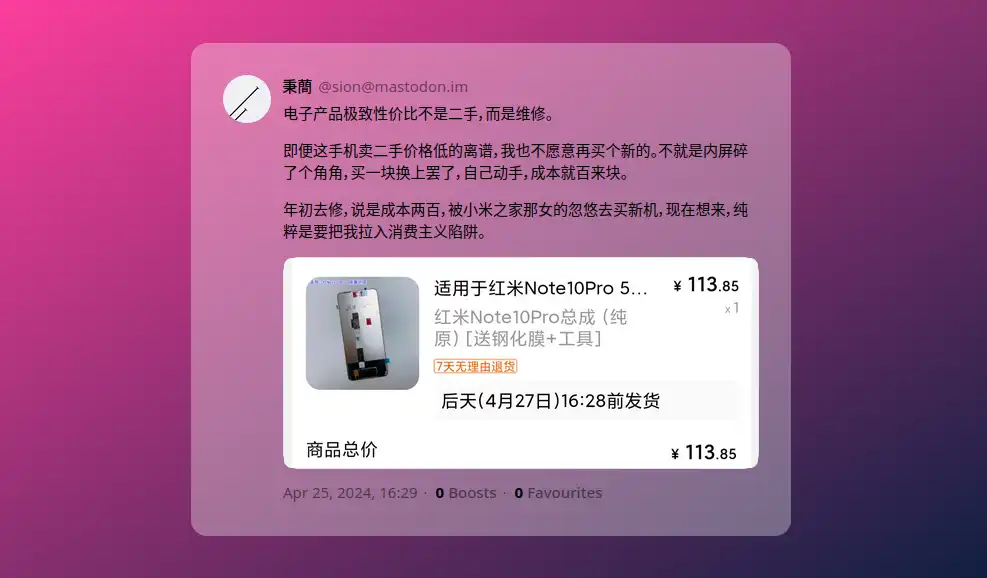 If buying second-hand is more sustainable, Repairing it first-hand is seriously sustainable.(如果说买二手更可持续,那么修理一手就严重地可持续) ——Sion the Maintenance engineer