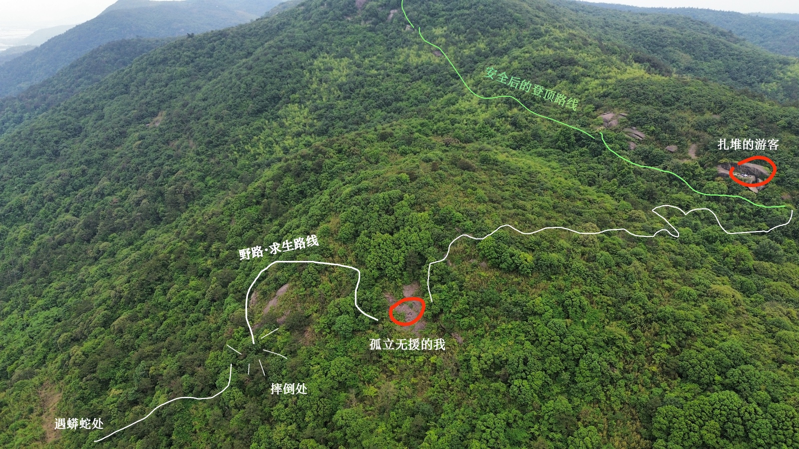 不过是我顶着被人们怀疑是头特立独行的野猪从树林里窜出来的勇气往前走罢了。最后从树林里找到被人踩出来的主干路结束求生,扔掉木棍开始往山顶进发。大概的路线如下: