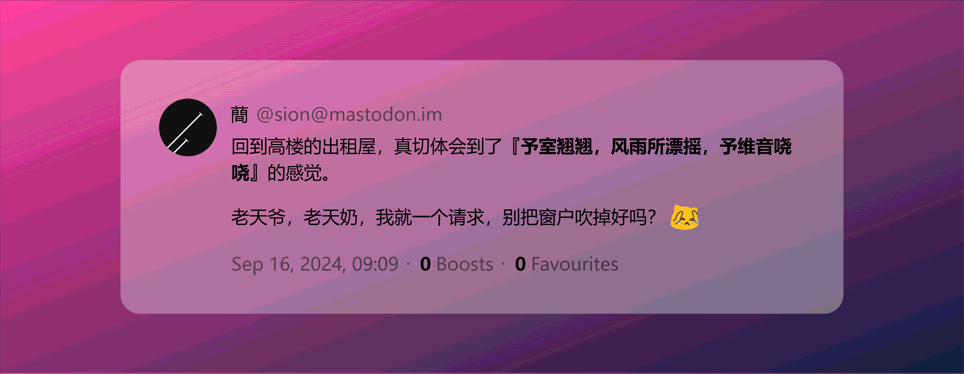 刮台风的时候,窗户被吹的哐当当响 ,很有诗经里那只猫头鹰的感觉,那就叫做——“予室翘翘屋”(翘翘:形容危而不稳的样子)