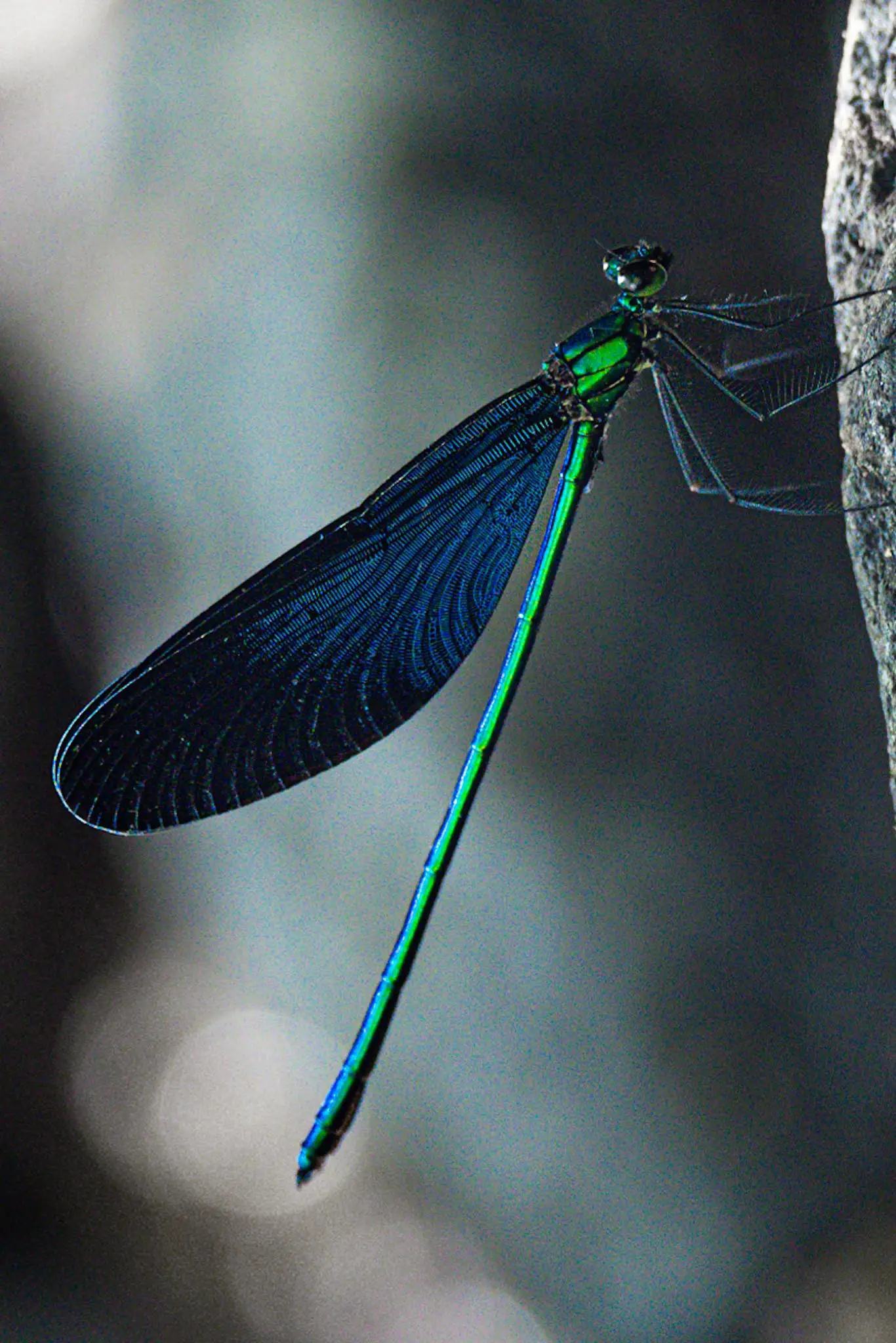 行走间,忽见蓝影翩翩溪流上,余甚为惊讶,追逐而行,欲拍之。少顷,蓝影止于一突兀石上,吾缓慢凑近,调整参数,摄以特写,定睛看,乃一蓝色蟌䗓,其体碧绿,其翅翠蓝,世间竟有如此华丽之虫,相较之下,往日所见之蓝色摩萝叶甲也顿失趣味。